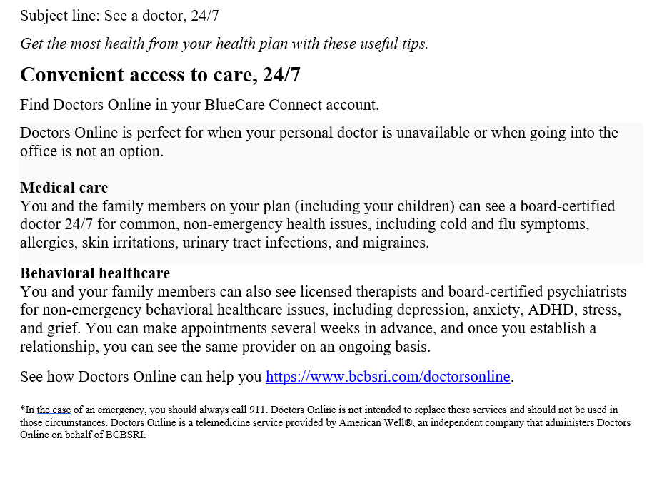 If your BCBSRI health plan includes Doctors Online, encourage your employees to find - and use - Doctors Online in their BlueCare Connect accounts.